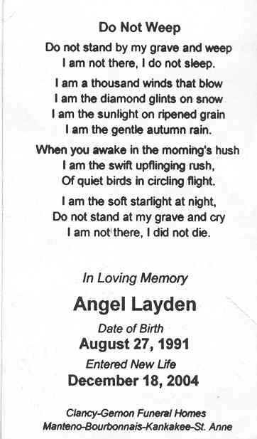 Me (Nicole), Angel, Ashley Brosseau, and Lauren Shipley were four inseparable friends. Whenever one of us was doing something, the others had to do it with them. Her death has put a void in our hearts and in our souls forever.
