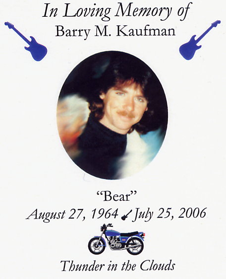About a week before his accident, Barry stopped by to see me. I hadn't seen him for a little while and it was cool that he had stopped. As we get older our lives are changing and we lose touch with what we later may regret. We talked about our jobs, toys, and women. He played my new guitar and told me about his new one. We talked about his bike and he was going to bring it by for me to see. I was looking forward to seeing him again. I'm going to miss him and the good times we shared.